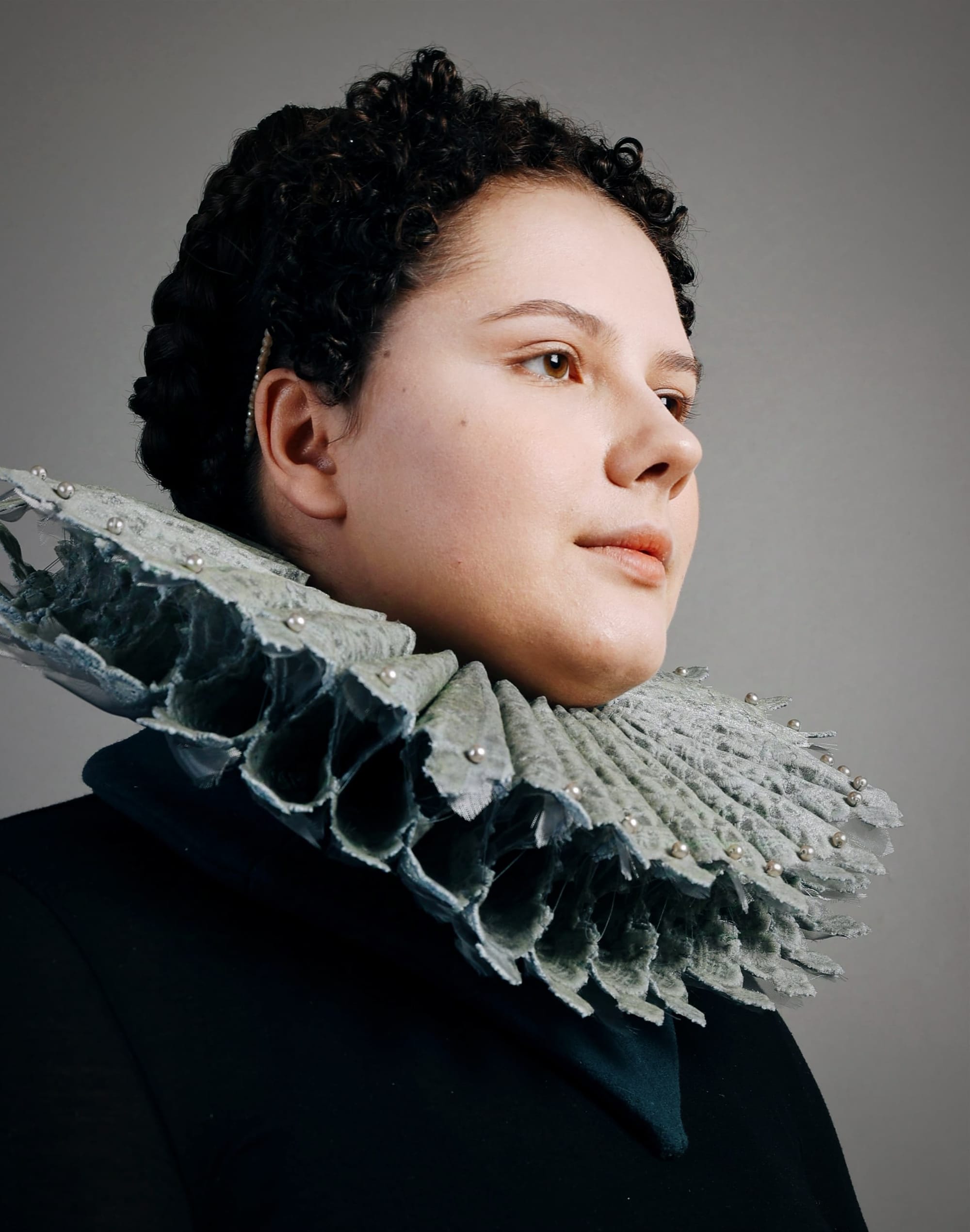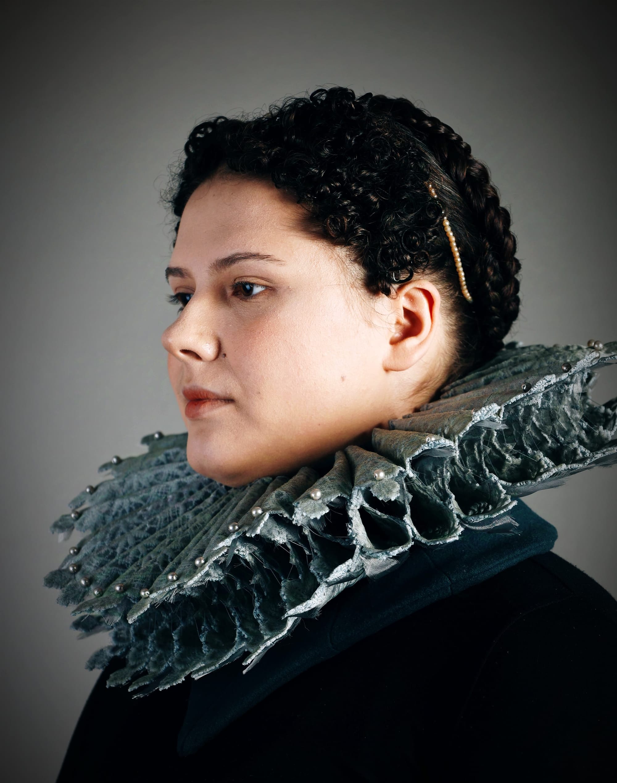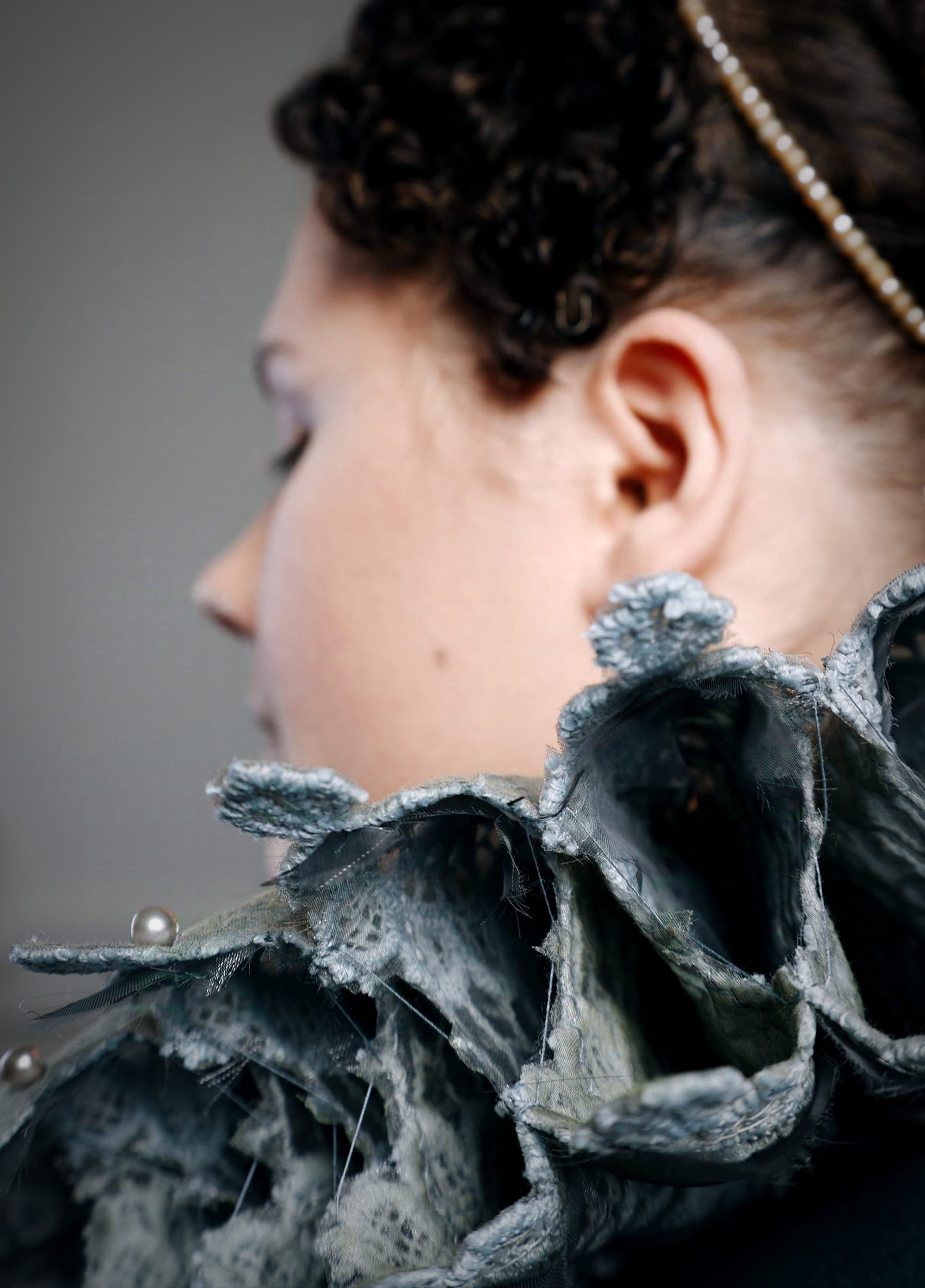 Während das Original eine offene Krause am Kleid zeigt, habe ich eine geschlossene Form Form gewählt, um die Strenge und Materialwirkung zu verstärken.