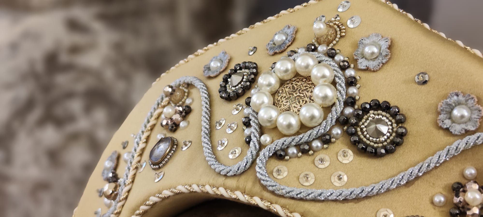 Ein von mir gebogenes Untergerüst aus Federstahldraht trägt einen mit Perlen bestickten Satinbezug. So verschmelzen Konstruktion und Ornament zu einer Einheit und verleihen der Haube ihre charakteristische Spannung zwischen Strenge und Zierlichkeit.